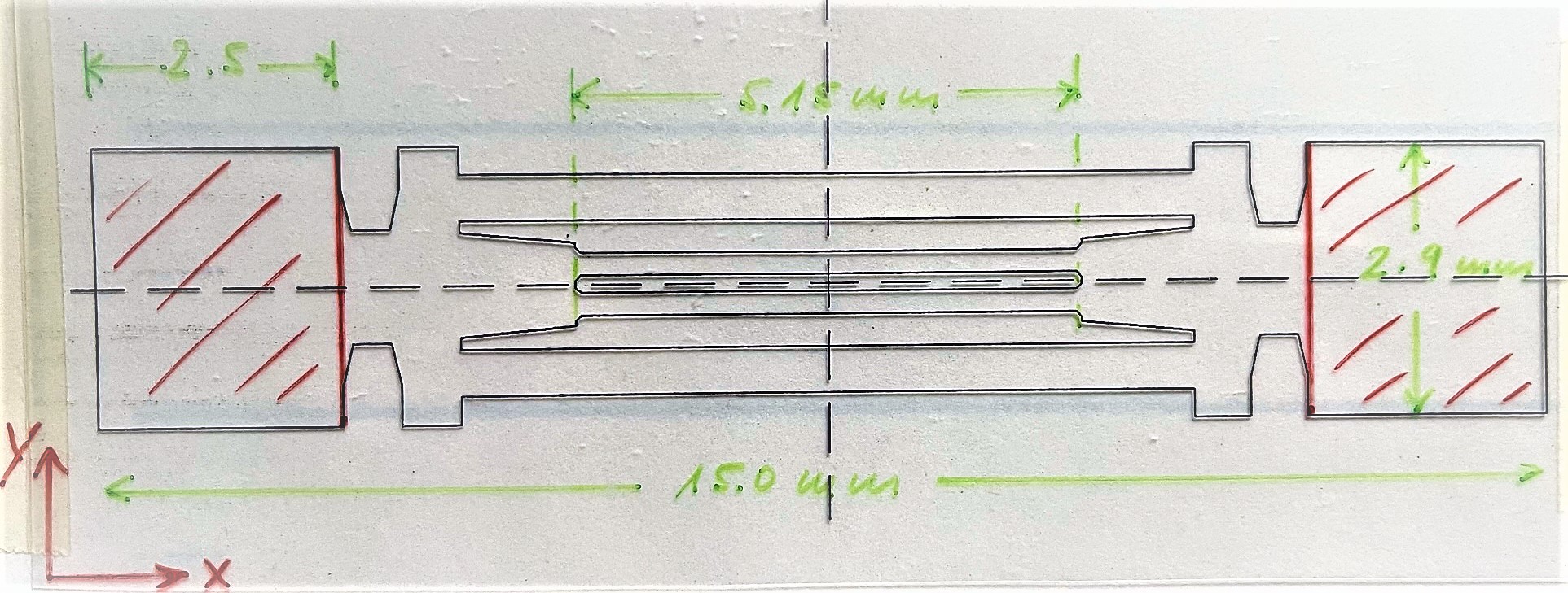 - definierte, uniaxiale Krafteinleitung (Vermeidung von Schereffekten) zur gleichmäßigen Belastung der Stimmgabelstege