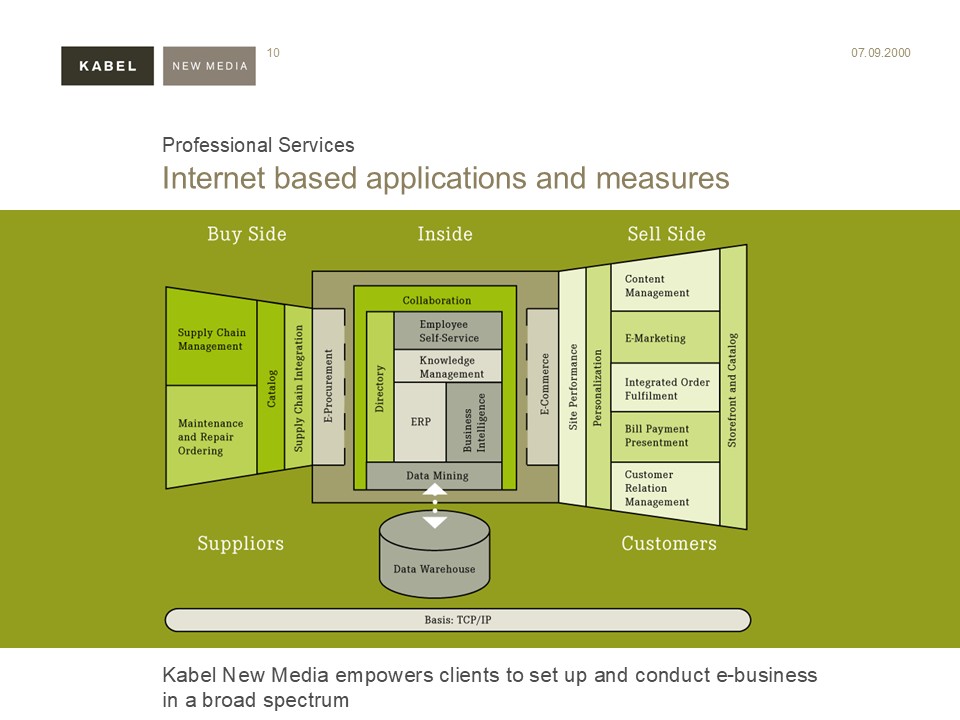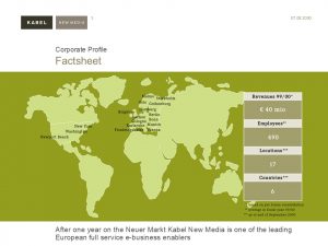 Kabel New Media advises leading companies in the field of electronic marketing and e-business. Kabel New Media develops and implements interactive business strategies and digital communication solutions on all electronic platforms. In 1998, the company recorded one of the most dynamic growth rates among the top ten in the German new media industry.
