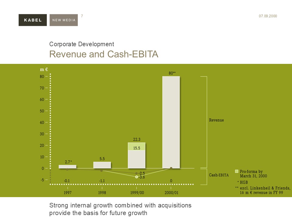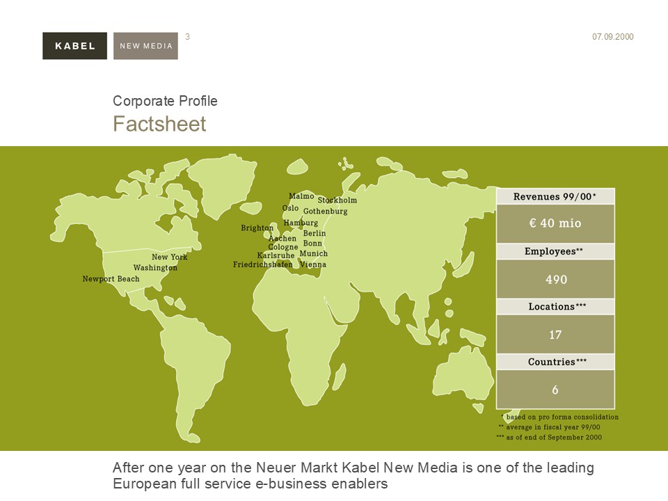 “Kabel New Media provides consulting services for leading companies in the field of electronic marketing and e-commerce and offers its clients an all-round support package. In the first quarter of this year Kabel New Media turned over DM 3 million, making a loss of approx. DM 0.09 per share. On this Thursday’s showing Kabel New Media was among the day’s tops on the ´Neuer Markt´ sector of the Frankfurt stock exchange, gaining more than 50 %. Interstoxx talked to the company’s CFO, Fritz Mathys, Interstoxx, 1999, June 25th