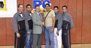 Olympic fighters supporting the German Taekwondo Premier League (Bundesliga) team TeamKWON: team head coach Aziz Acharki (left), team members Mohamed Ebnoutalib (European & vice worldchampion) with team manager Thomas Fabula (European & vice worldchampion) and Mohamed Azhamriue (multiple German champion), Achmed Boumrah (3rd student world championships), right.
