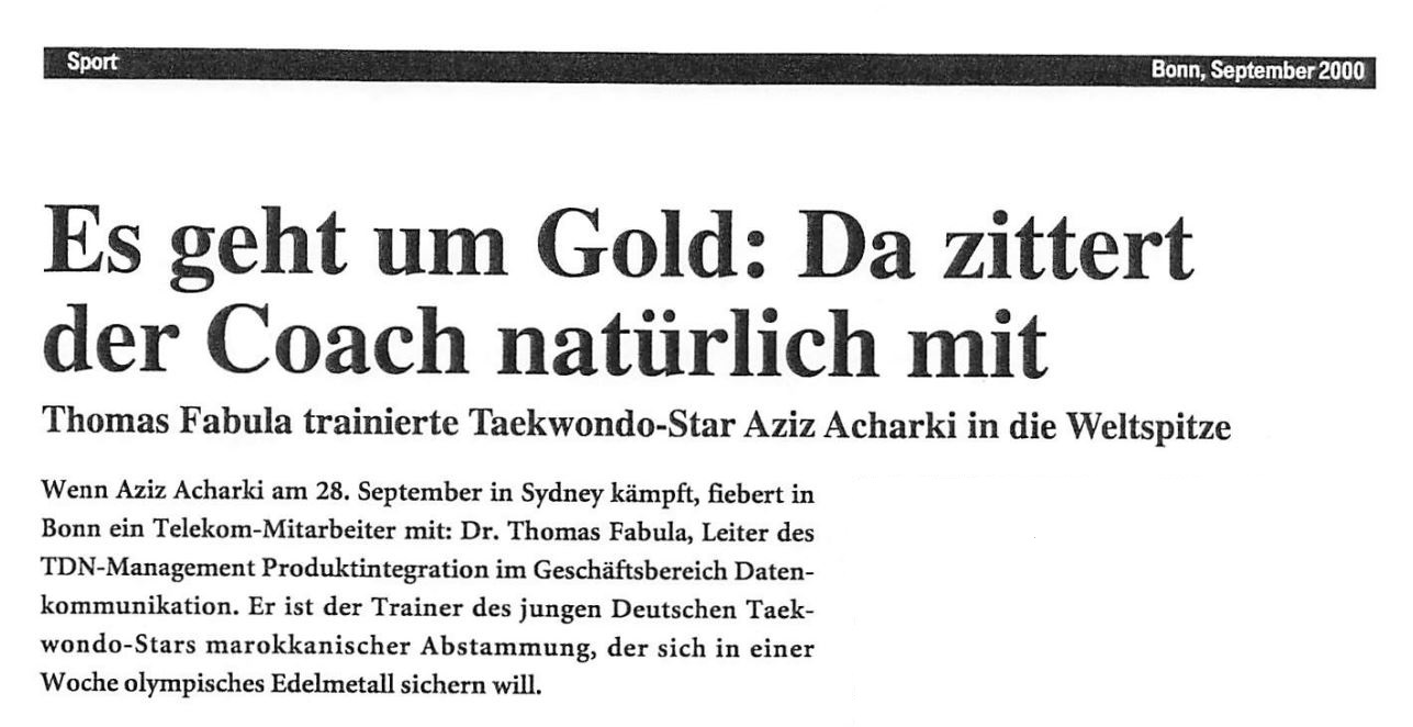 Acharki pflichtet ihm bei: “Beim Kampf bin ich in einem eigenen Raum. Darin ist es ganz still. Auf der Tribüne können Tausend Mann schreien, ich höre nichts.” Von außen sieht es dann aus wie perfektes Ballett, eine lebende, lauernde, tänzelnde, kämpfende Einheit des Widerspruchs. Ein einziger Körper aus zweien. Das Jargonwort der Taekwondo-Leute dafür ist “Flow”.